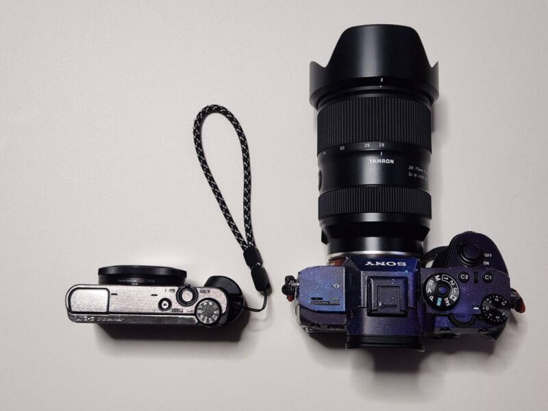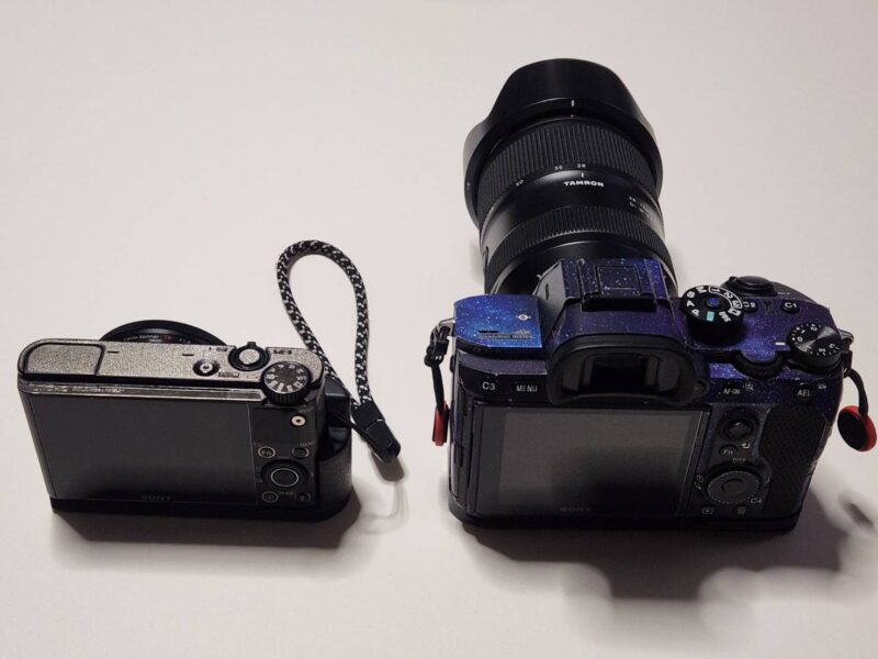 左のRX100も起動したら多少レンズが前に飛び出します、右のカメラα7R3はレンズを自由に選べる事でレンズの長さは色々ありますが、ボディの部分だけでも大きさや厚みが違うのは一目瞭然だと思います