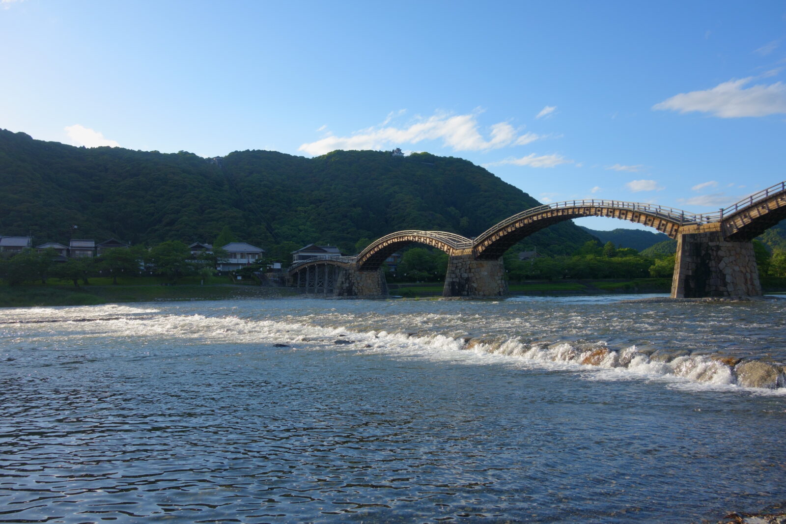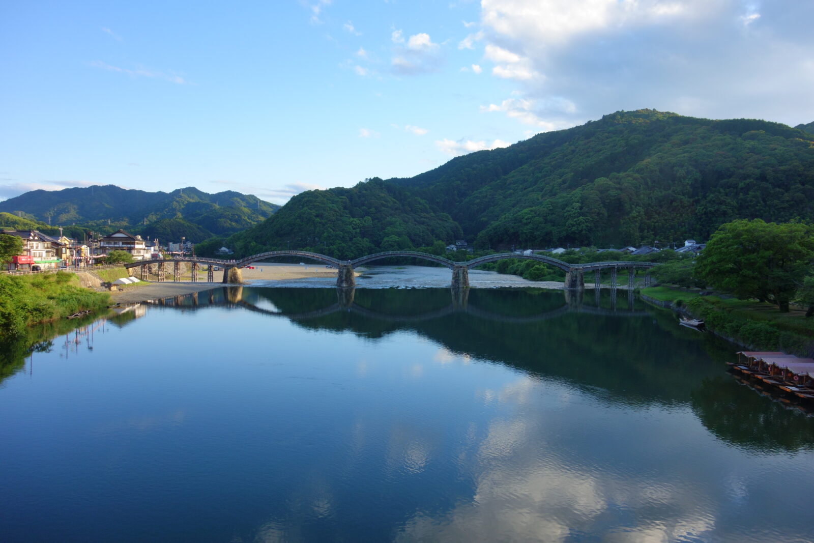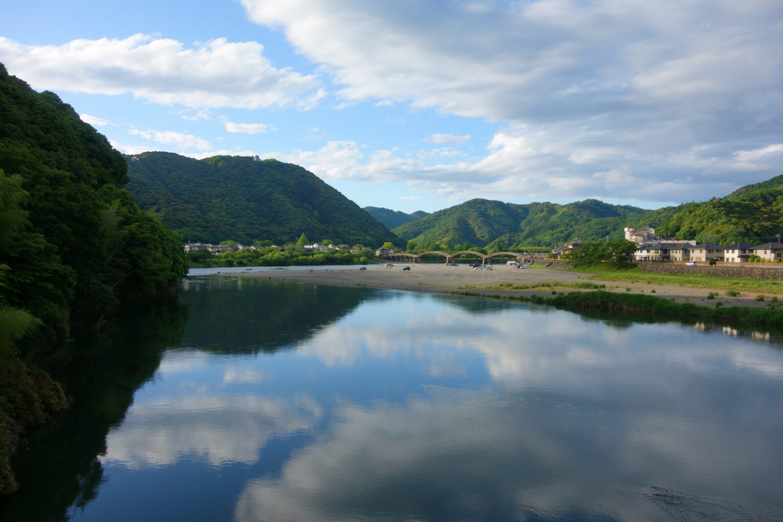 錦川と錦帯橋の構図に感動して撮影しましたが、もう夕方6時頃ですがそんな感じもしないくらい明るいですね。