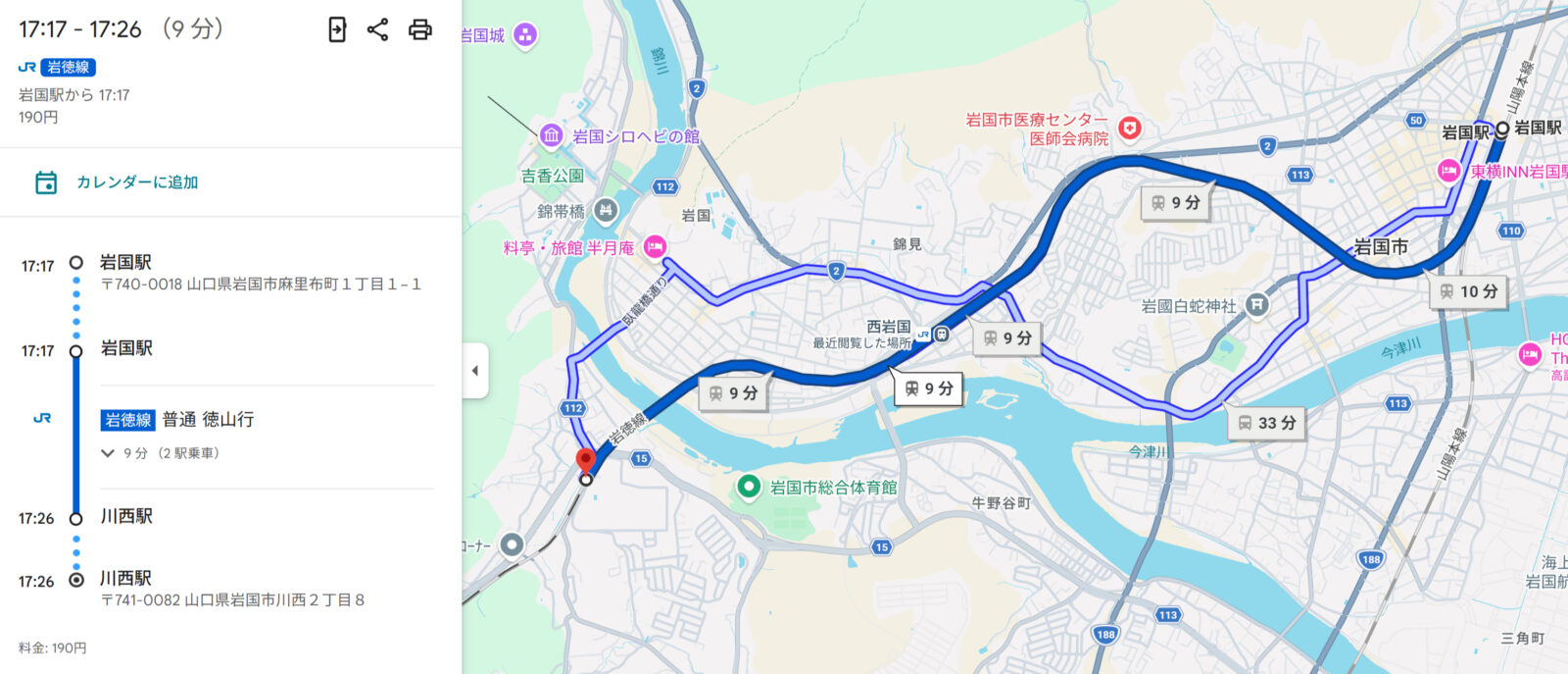 新幹線を併用して博多駅➡広島駅➡岩国駅ルートで行けば2時間少しで到着しますが1万円はかかります。