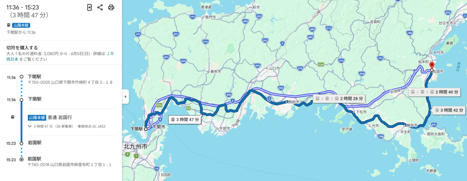 下関駅に到着後、岩国駅へ向かう為にいかに安く乗れるか検索していたら、、、この時間帯が一番安く(3080円2024年現在)乗れそうだったのでこの電車で行く事にしました、、、約4時間ですこんなに電車に乗るのは初めてとるんが言ってました。みっちゃんはそんなに時間かかるなら博多駅から新幹線を併用していけばと言ってましたがお金も2倍くらいかかるので却下になり不満そうでしたね。
