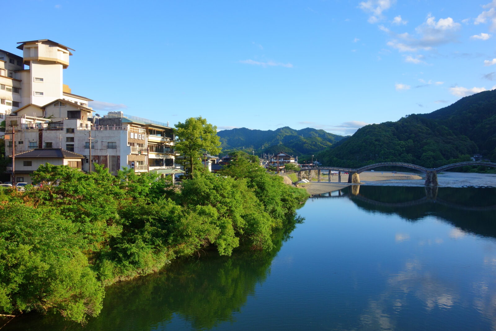 錦帯橋温泉 岩国国際観光ホテルと錦帯橋を同時に撮影しました、こういう写真好きなんです。