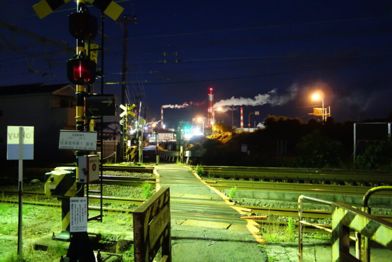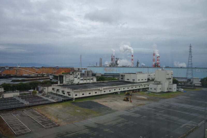 駅に戻る途中の海沿いには工場地帯があり煙突から白い噴煙が天に上っていました。