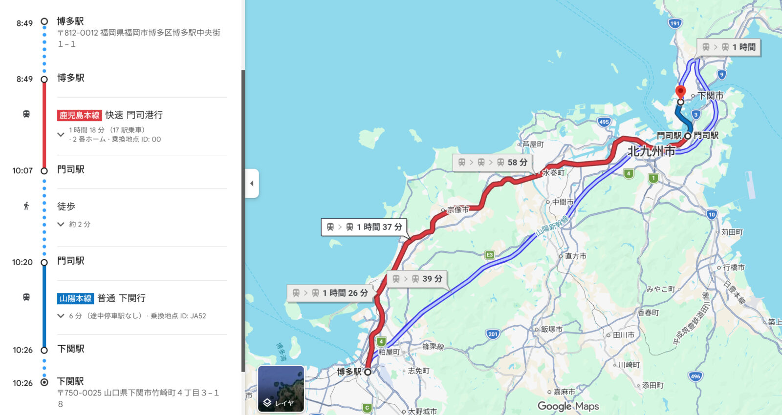 1日目は電車で博多駅➡岩国駅(山口県)までローカル線で約5時間以上かけて移動します。