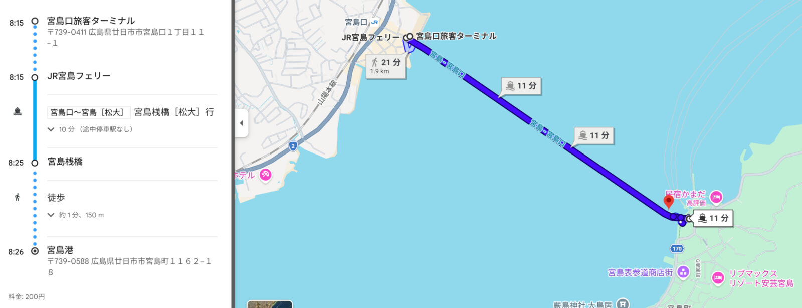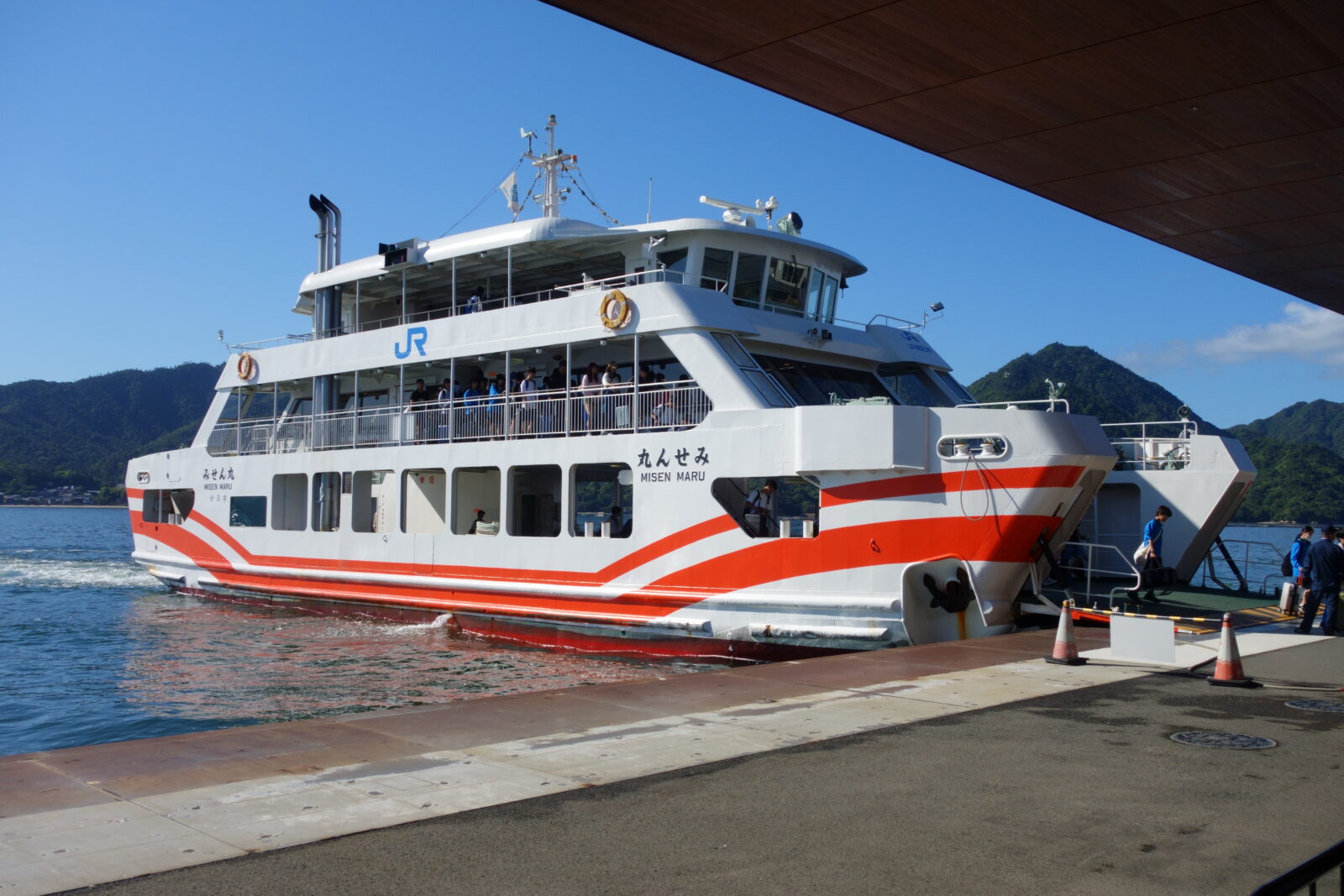 1日目の岩国駅から[山陽本線]宮島口駅へ到着後、宮島行のフェリーに乗ります