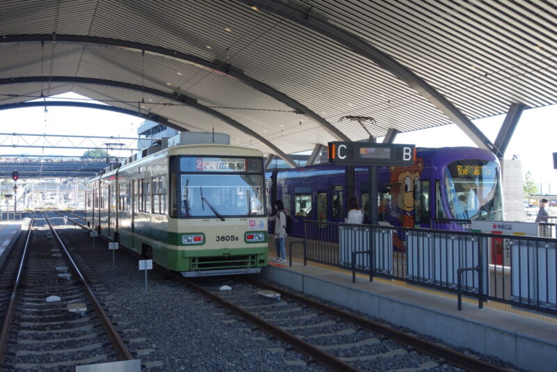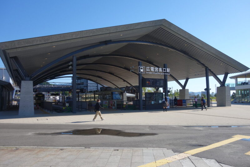 宮島行のフェリー乗り場に向かう途中に広電宮島口駅という場所があり.タイミングがあえば利用したかったのですが今回の旅では写真だけになりそうです。そして宮島行フェリー乗り場に到着した二人は乗船チケットを購入してフェリー到着を今か今かと待っていました。