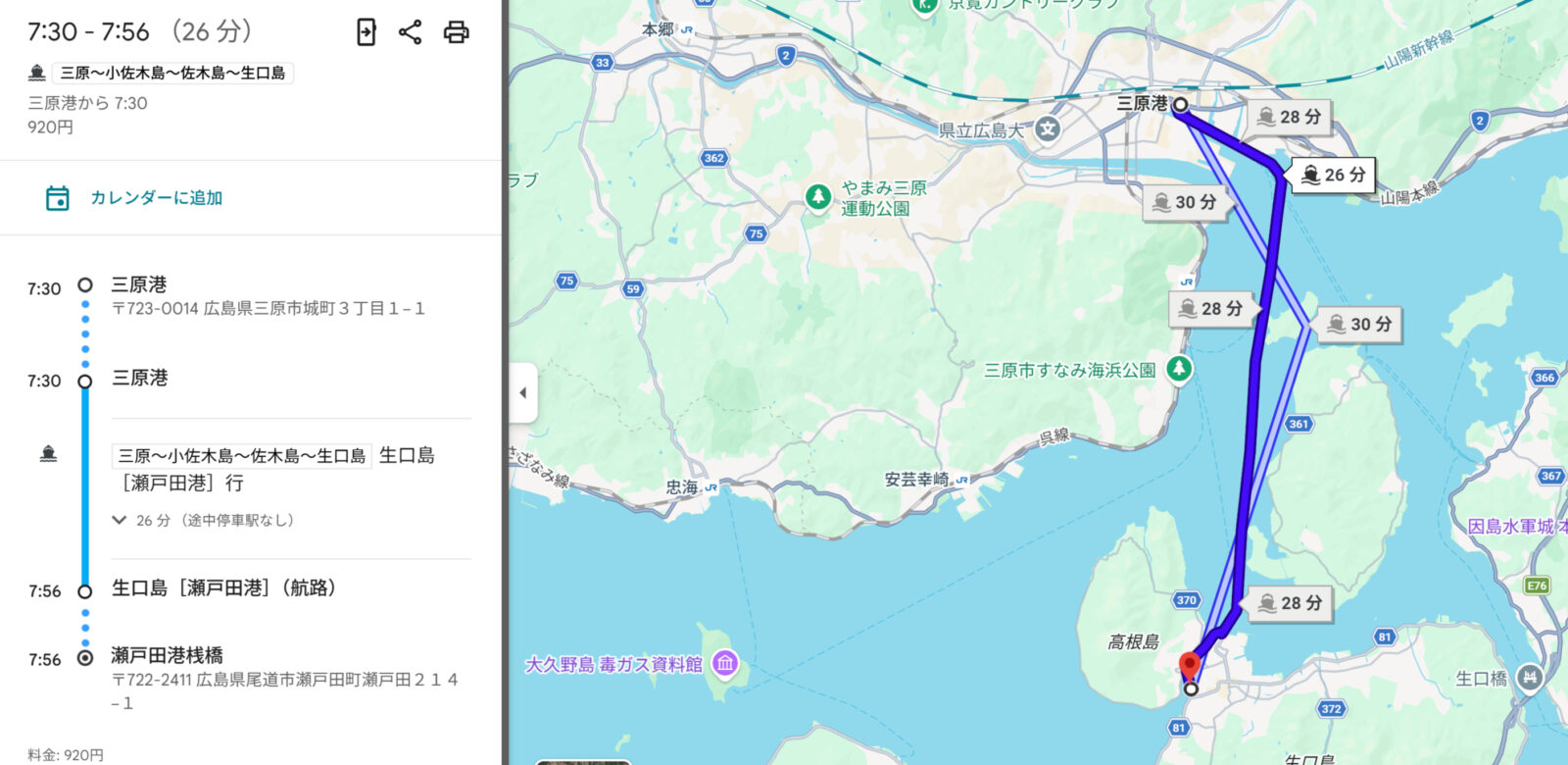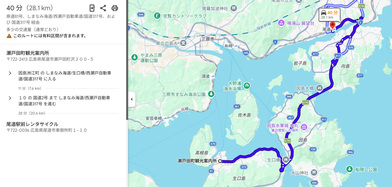 ここで画像の注意点です、なんと自転車のカテゴリーがルート検索で表示されませんでした!!仕方なく車のルートを表示しています。瀬戸田観光案内所で自転車を借りて尾道駅へ移動するルートですが観光地などを色々立ち寄っていたので青い線はあくまで自動表示の最短ルートです