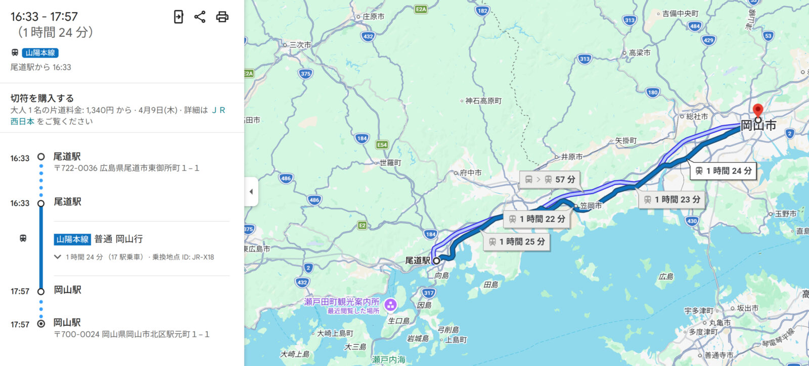 尾道で自転車を返却した後に3日目のホテルがアビスイン岡山なので尾道駅から岡山駅へ向かいます