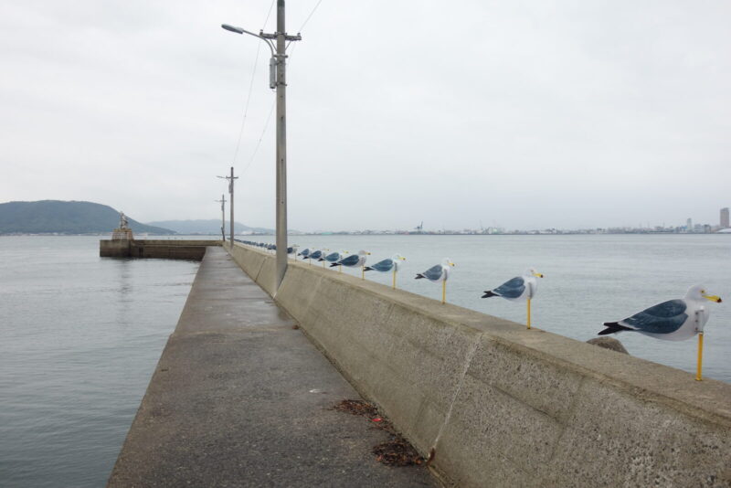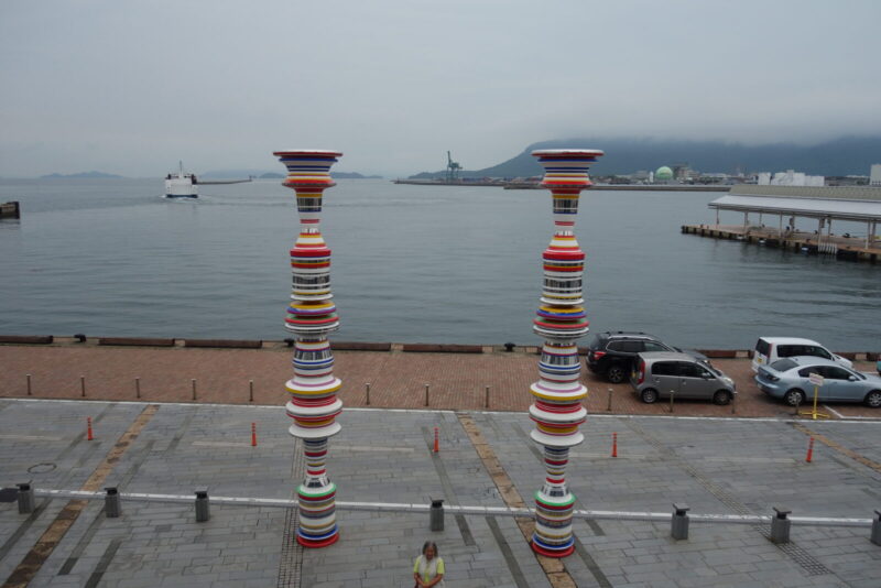 二人はおもしろい顔した駅から高松港へ到着、この気になる2本はいったい何でしょうね
