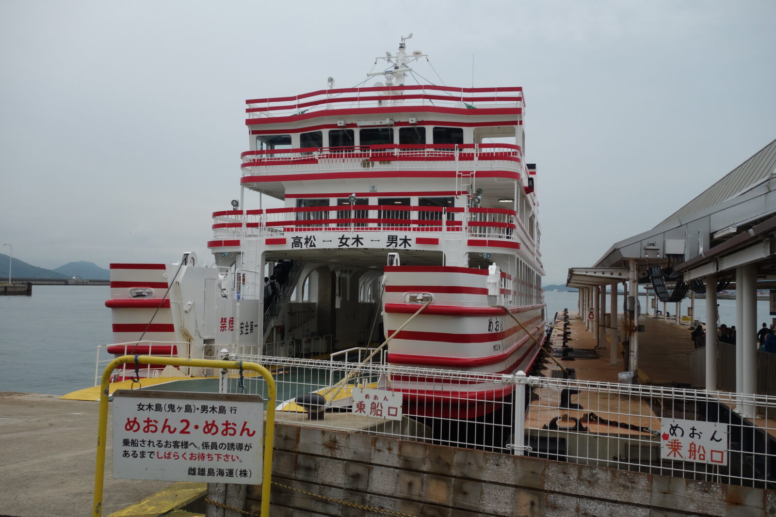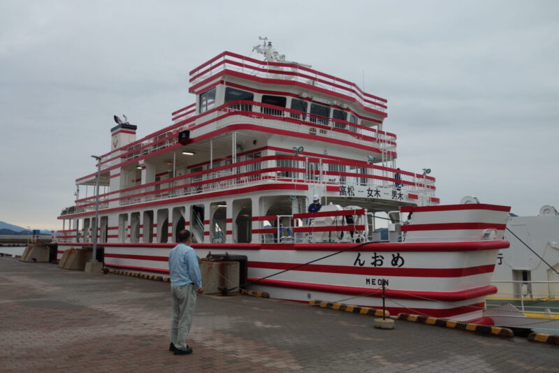 10時出航のフェリー「めおん」が近づいてきました、最初に説明した通り女木島行きのチケットだけ購入して乗船します。あいにくの天気予報ですがこればかりは仕方ありません、天に祈るのみです。