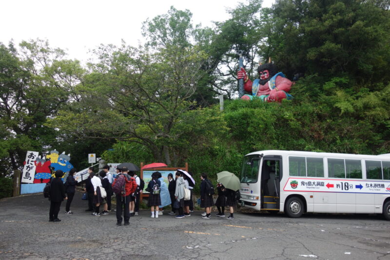 鬼ヶ島へはバスが運行しているのでレンタサイクルは借りません、鬼ヶ島 おにの館でバスを案内され鬼ヶ島大洞窟の入口まで運んでもらいました