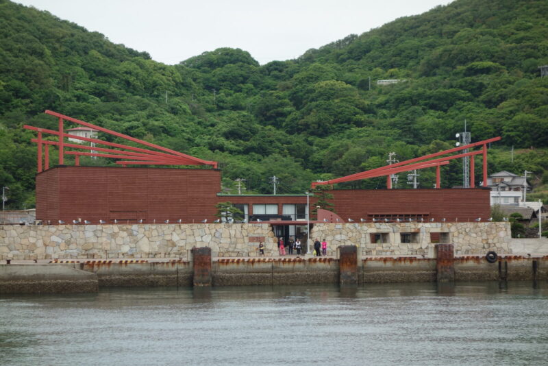 高松港からフェリーで20分もうすぐ女木島へ到着します、この見たことのない形をした建築物は鬼ヶ島 おにの館といい観光案内所みたいな感じです