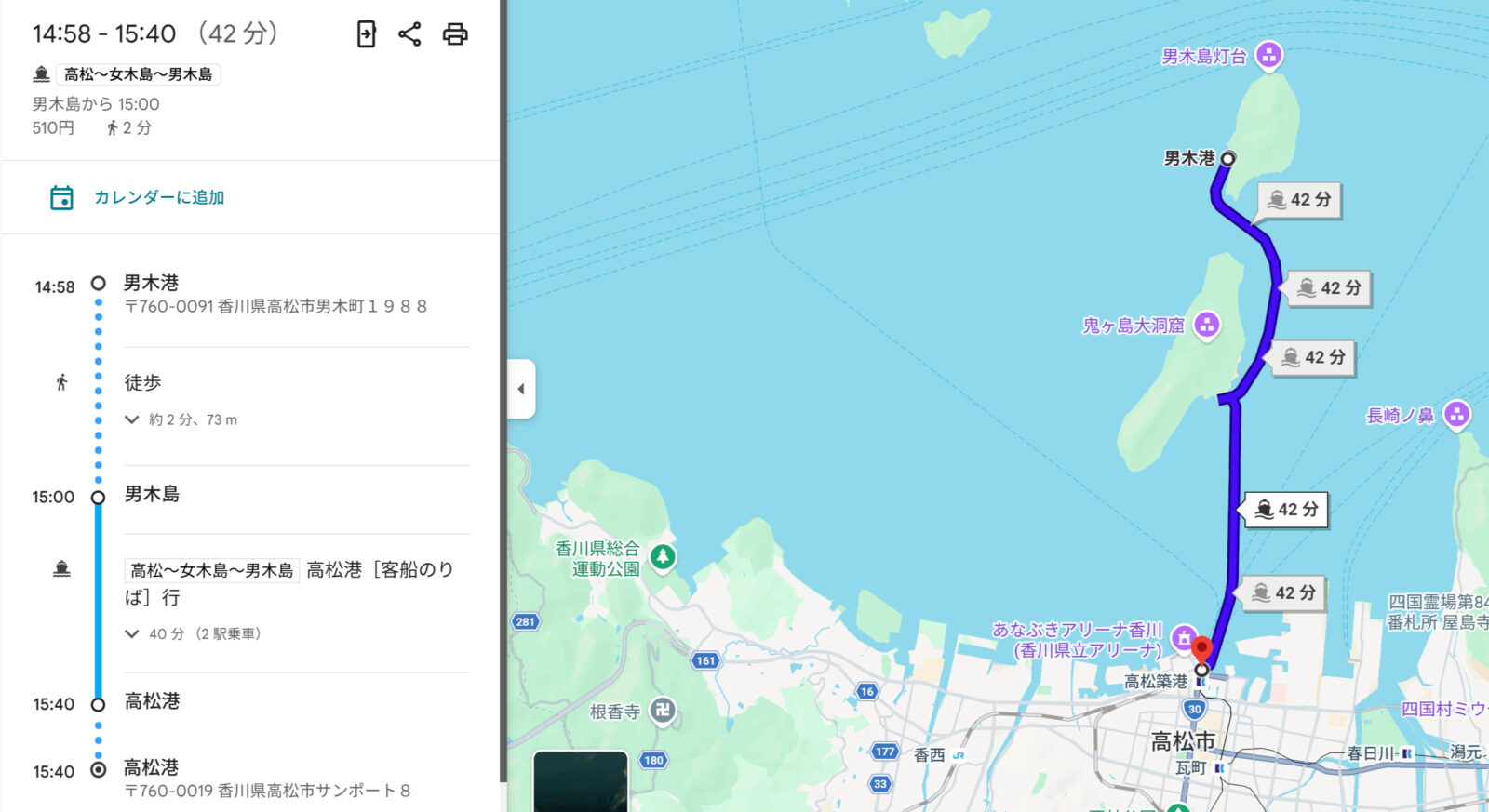 男木島を十分観光したら高松港へのチケットを購入してフェリーで戻ってきます、その後は高松センチュリーホテルへチェックインです