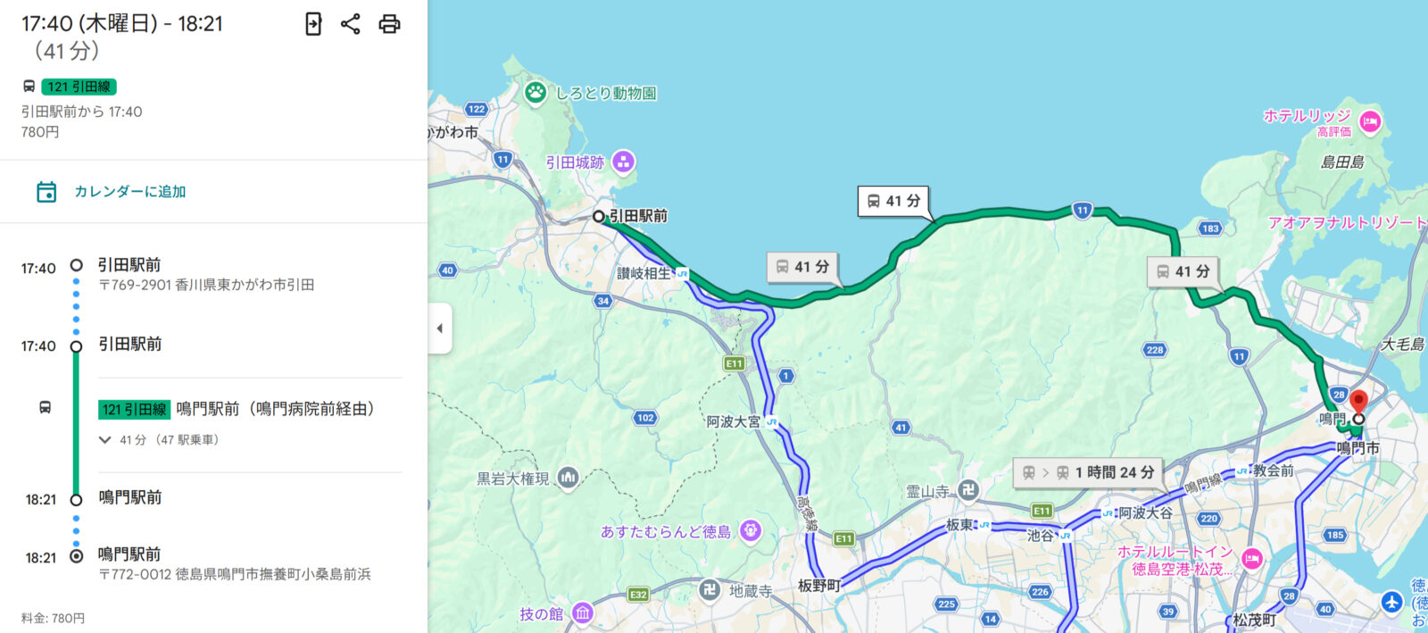 引田駅で降りて、近くの引田駅前バス停からバスに乗車して鳴門前駅バス停に移動します。(2024年バス料金650円)