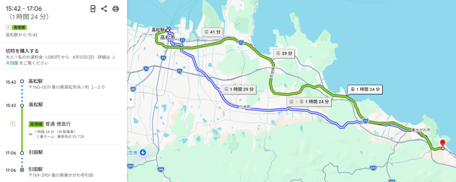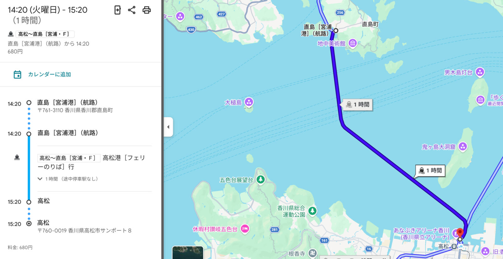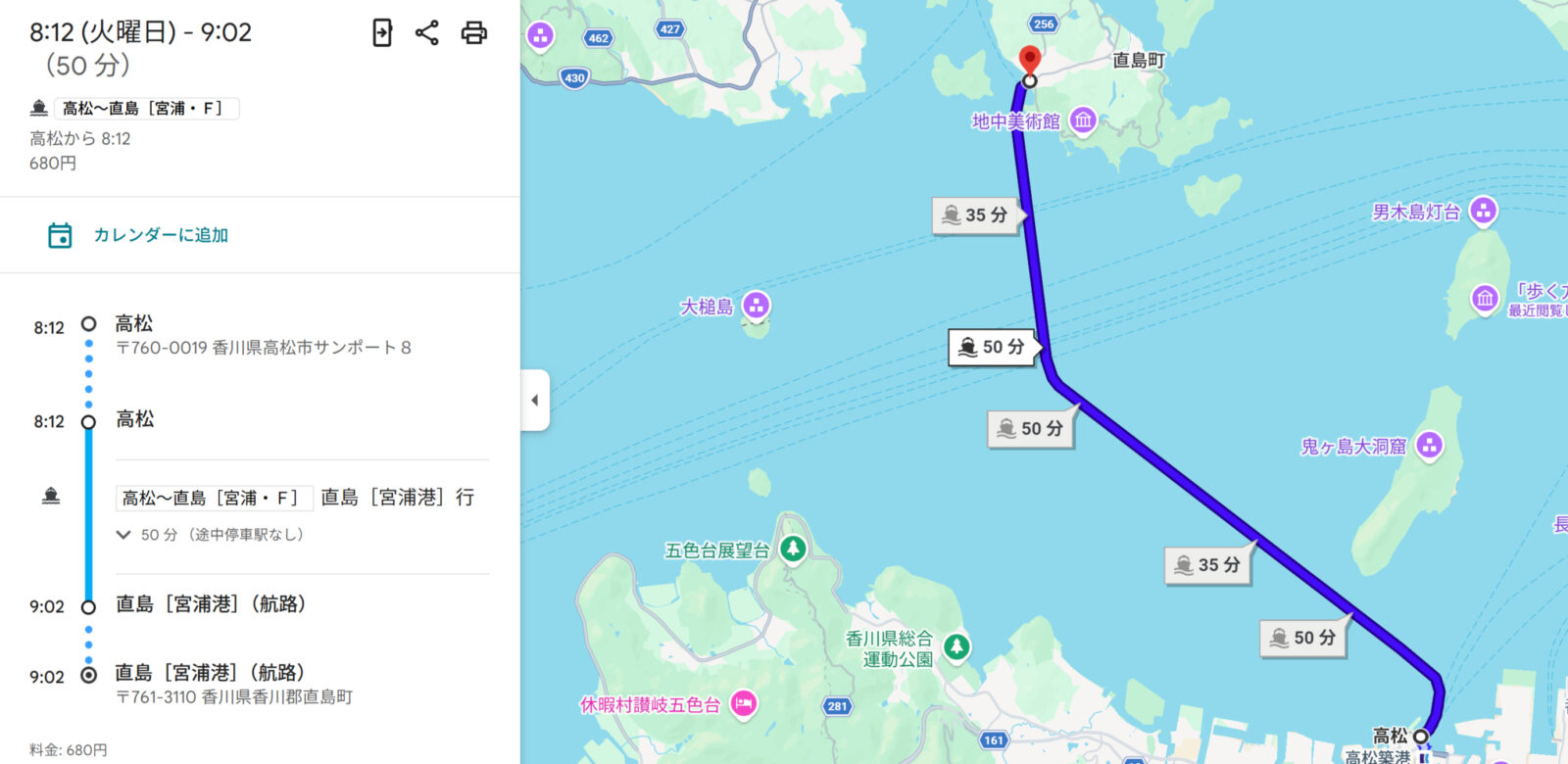 本日のルートはフェリーで高松港⇔直島を往復して、高松駅➡引田駅➡引田駅前バス停➡鳴門駅前バス停へと移動します