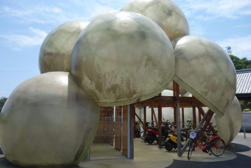直島町役場から移動中、本村港の近くに虫の卵みたいな丸い物体がデカデカと展示されていたので見にいくと、まさかの駐輪場だったとは、、、これがアートの島、、、