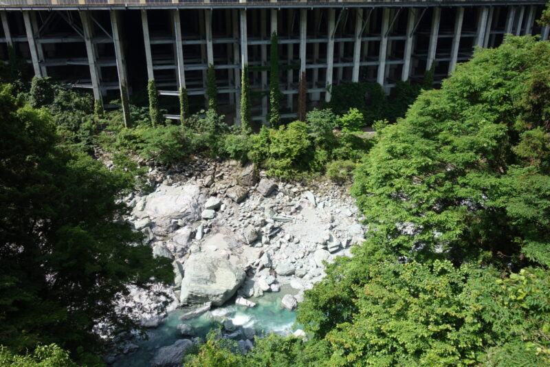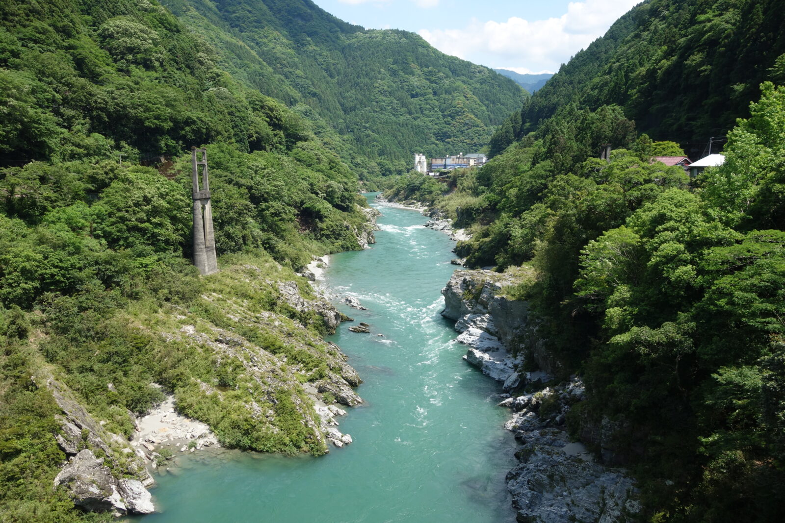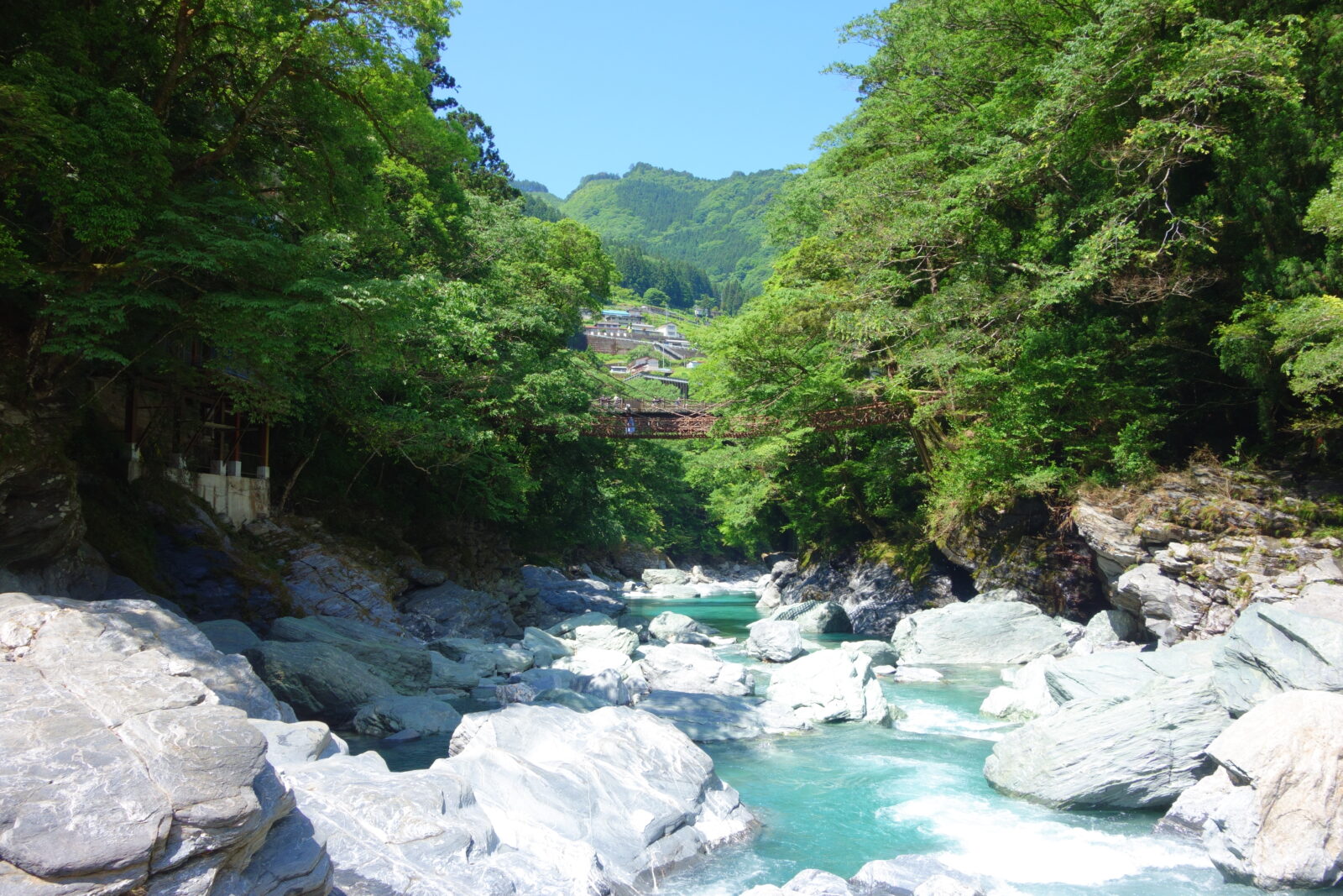 川辺に降りてかずら橋の方角へカメラを向けて1枚。朝の小雨が嘘のように快晴です