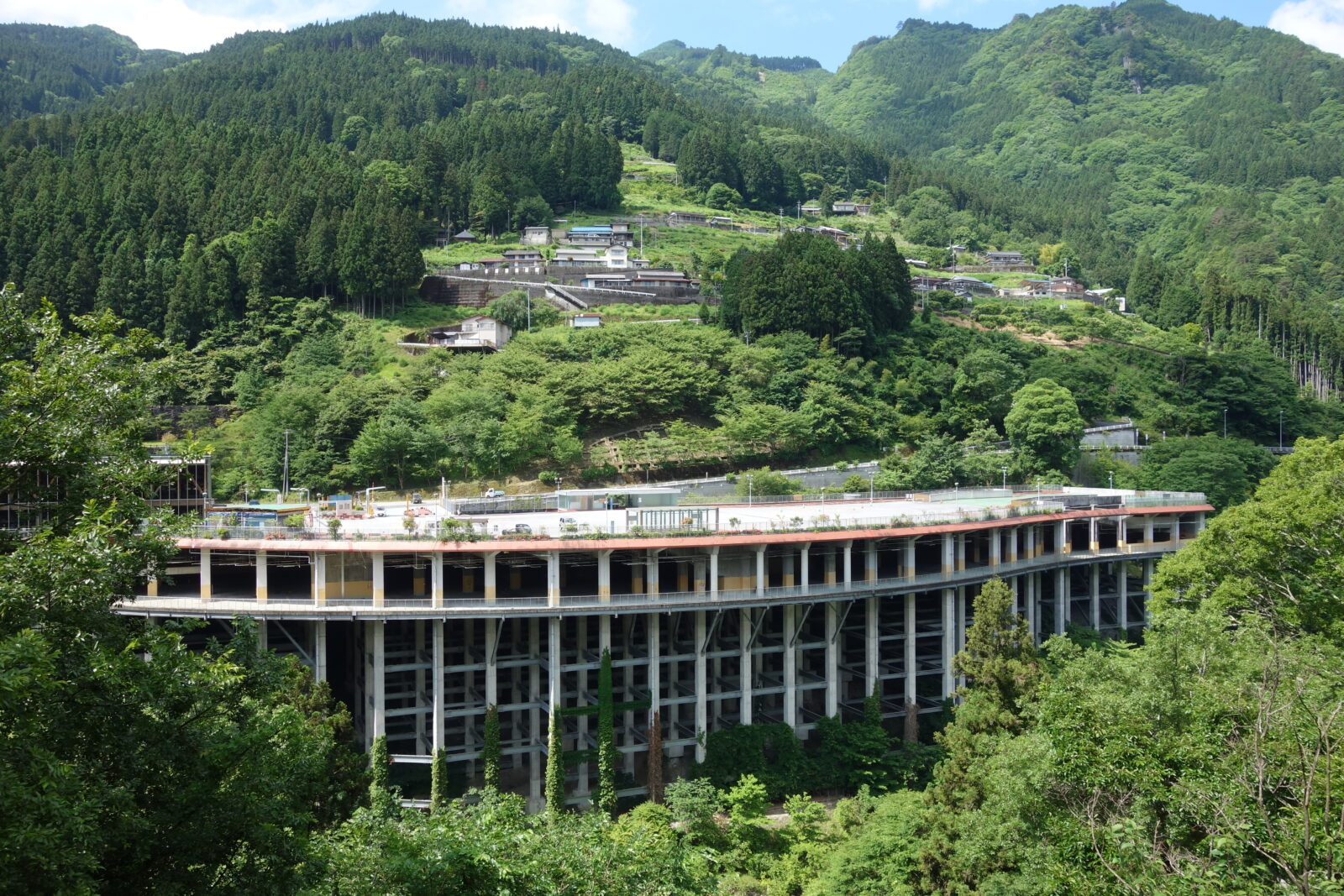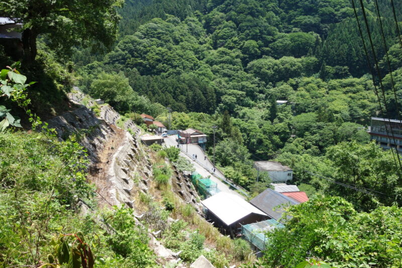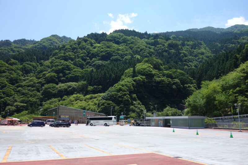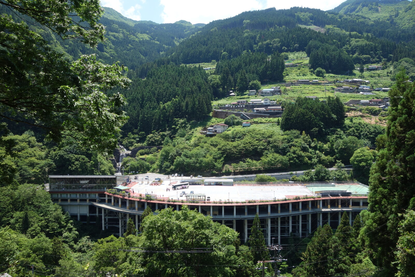 バス停からこんな景色が見れるんだよ、中心に広がっている場所は観光バスなどの駐車場とかかずら橋夢舞台の土産屋やバス停もあるんだ