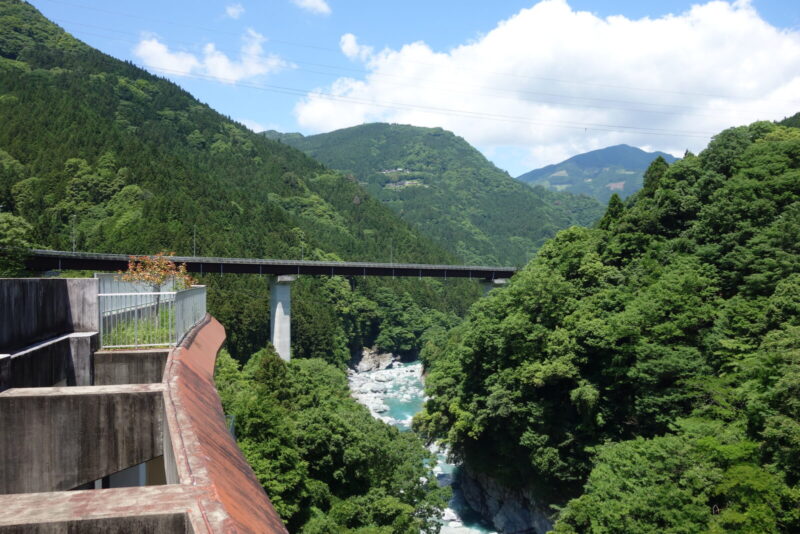 バス停から歩いて5分ほどで大きな橋が?祖谷渓大橋に到着です、観光客が見ている方角にこそかずら橋があります。