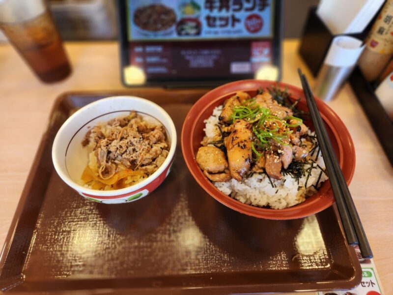 時刻17:30、昼食が団子と魚ぐらいしか食べてない二人は、お腹の空腹に耐えられずにすき家 高知本町店に入店、るんは2種類の丼をさくっと食べて夜食や朝食を買い込みホテルへ