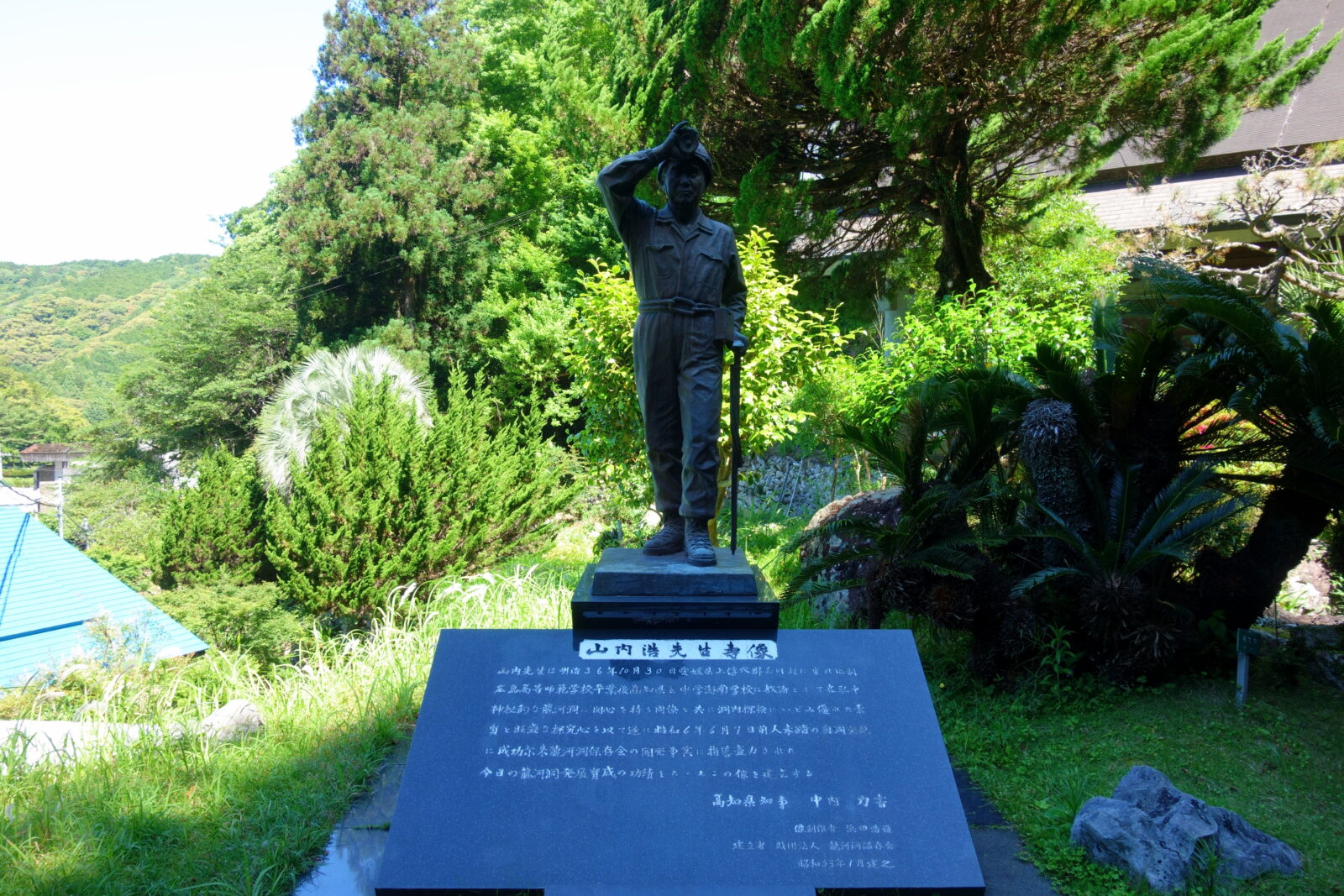 洞窟探索を終えた二人はバス停へ向かう途中で山内浩先生壽像を発見、昭和6年に前人未到であった大規模な鍾乳洞を発見された方らしいです