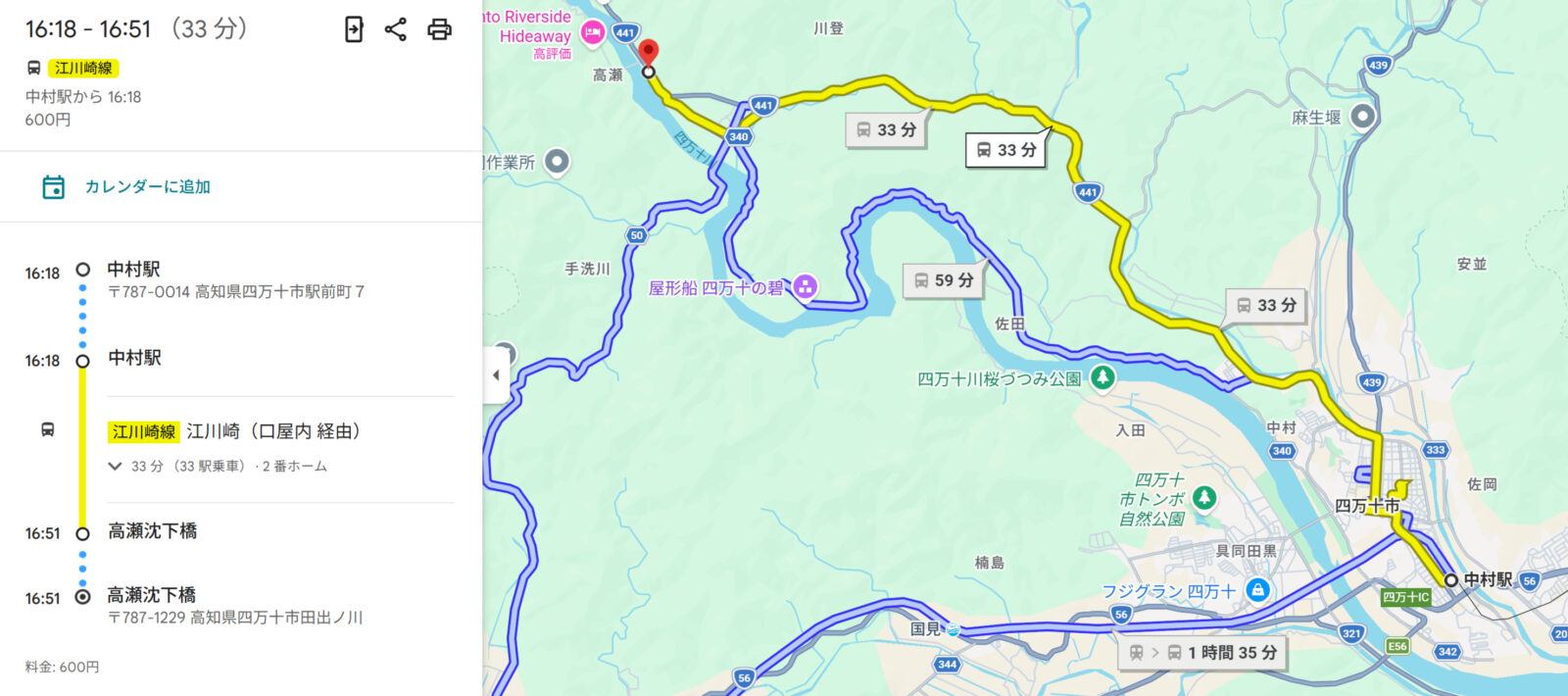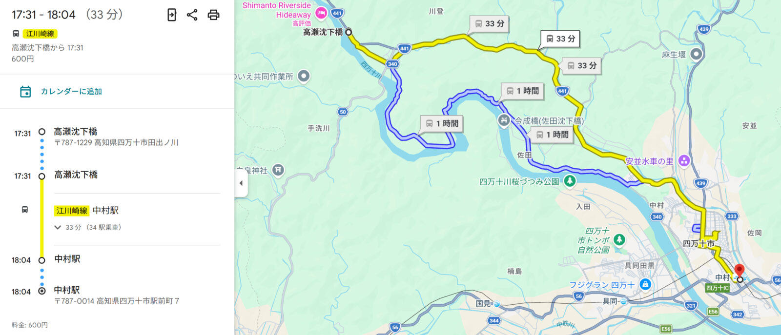 ③高瀬沈下橋を目指し中村駅(バス停)➡高瀬沈下橋(バス停)バス移動し高瀬沈下橋を見学後、高瀬沈下橋(バス停)➡中村駅(バス停)へ戻ってきます。