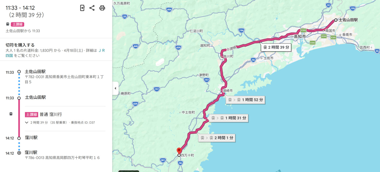 次の目的地は高瀬沈下橋なので土佐山田駅から[土讃線]窪川行に乗り窪川駅まで2時間以上の電車旅です