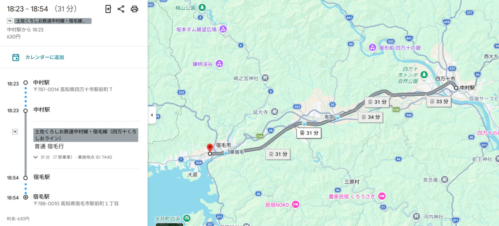 本日最後の交通機関は、中村駅から[土佐くろしお鉄道中村線・宿毛線](宿毛行)に乗車して宿毛駅へ、その後はホテルへ徒歩で移動します