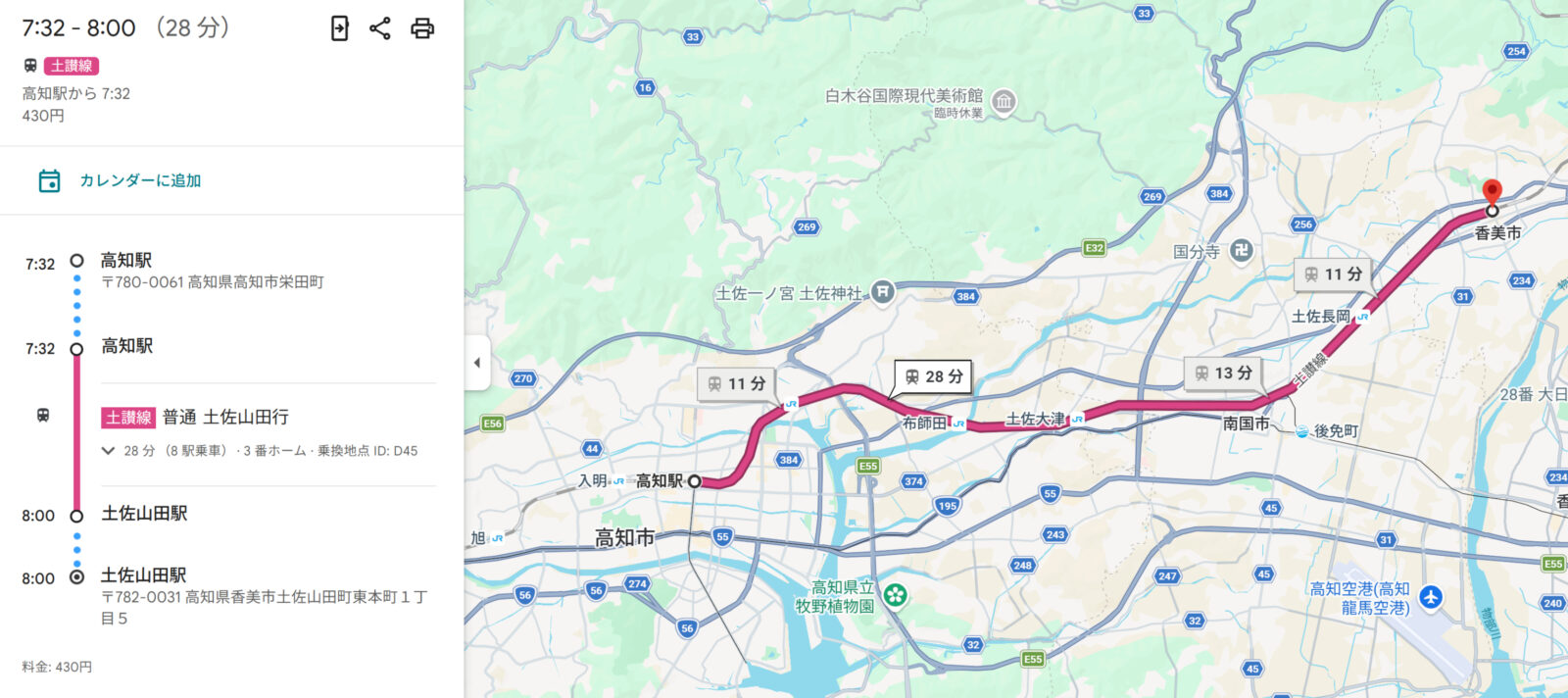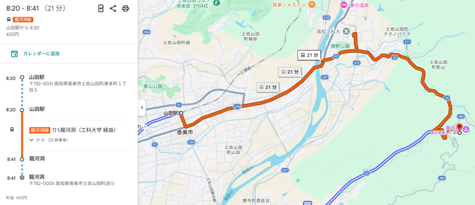 ①龍河洞を目指し高知駅➡土佐山田駅へ電車移動、山田駅(バス停)➡龍河洞(バス停)へバス移動します。
