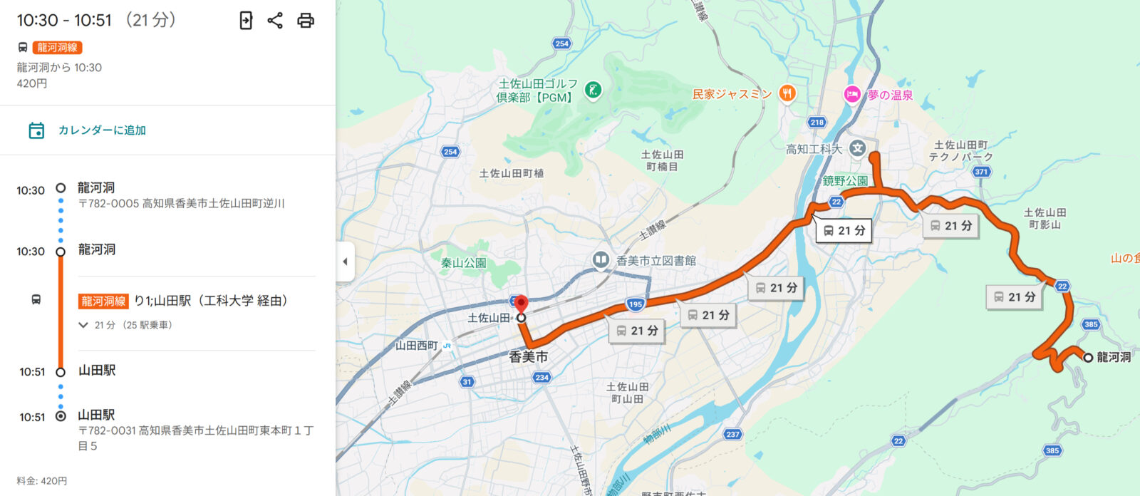 ここからはバス移動になります、駅近くの山田駅(バス停)から龍河洞(バス停)で降りて帰りも同じルートで戻ってきます。