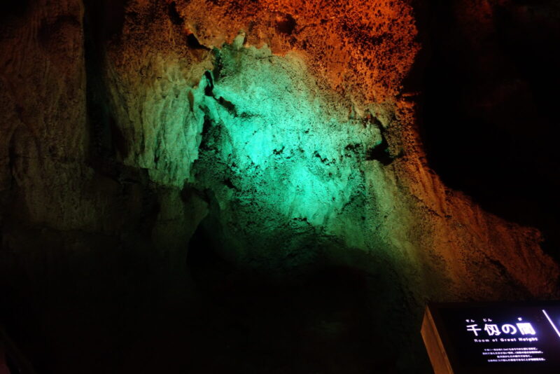 同じような色合いでライトアップされた洞内でもっとも天井が高い千仭の間