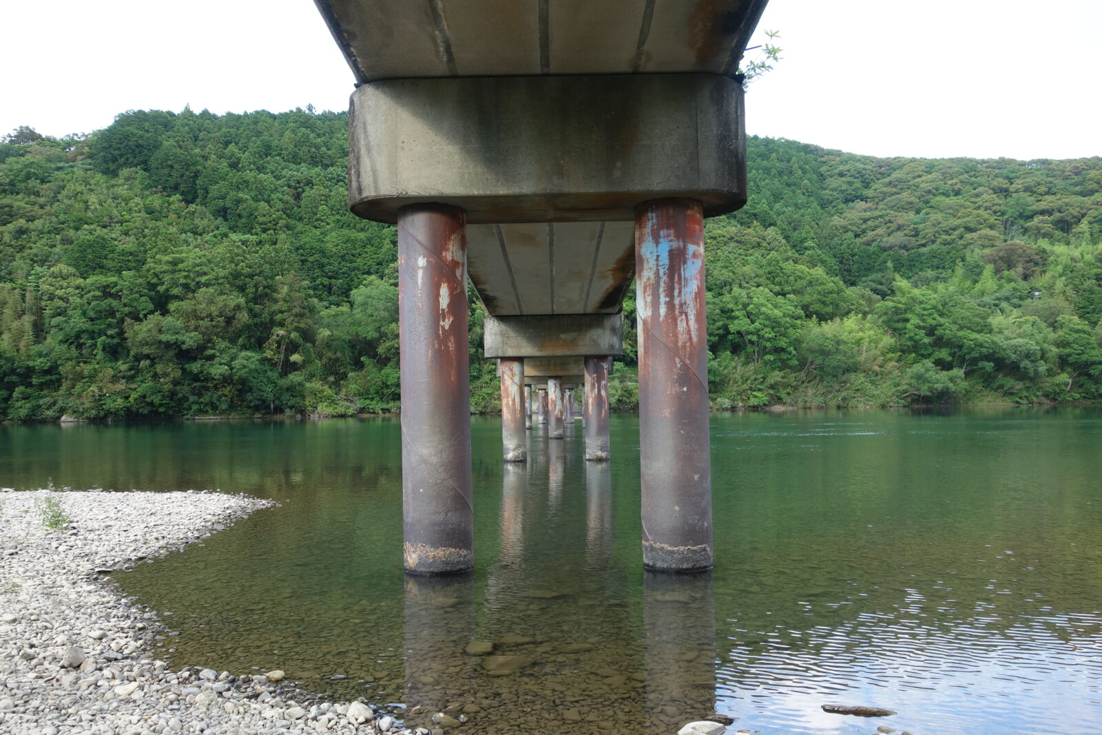 川辺に降り色々な方向から橋を撮影してみました、周囲の自然と調和した景観で静かな場所な事もあり最高でした。