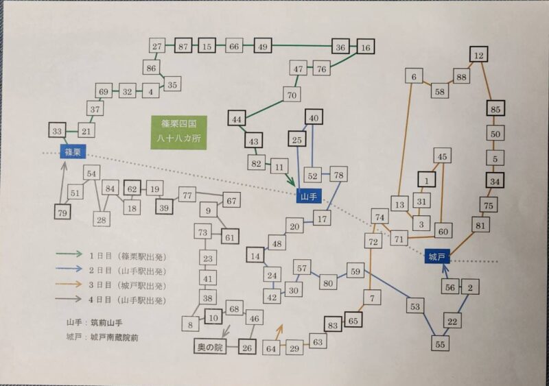 篠栗駅から若杉奥之院駐車場までタクシーで向かい奥之院を巡り篠栗駅方向に進みつつ札所を巡り最後に79番でお遍路完結です