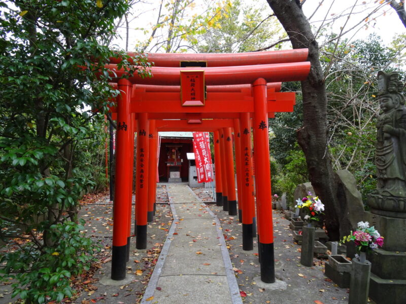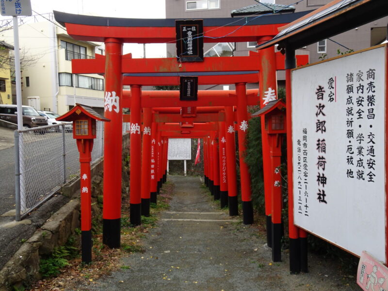 音次郎稲荷神社という今から300年ほど前に蘭方医の音次郎という人物が神威を感じてこの地に稲荷神社を祀ったことが起源とされているらしいですね、それでは赤い鳥居をくぐっていきましょう。