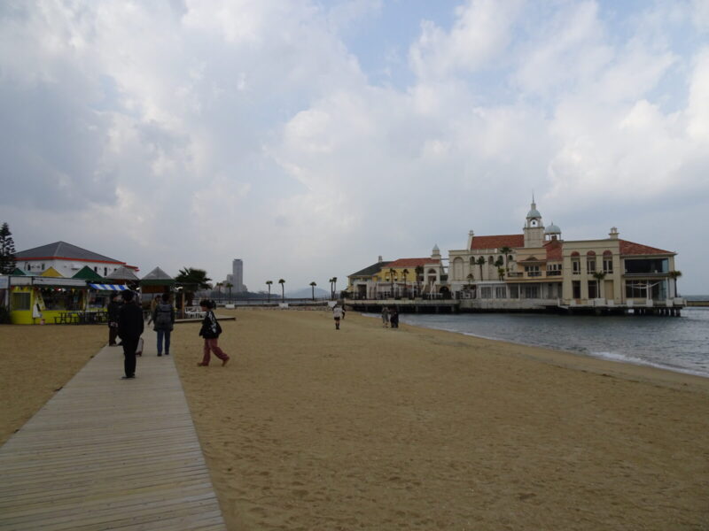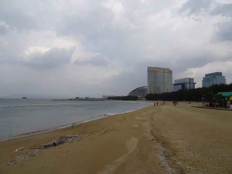 タワーから海の方角にはシーサイドももち海浜公園があり、浜辺散歩やショッピングも楽しめるリゾート感あふれるビーチパークとしても有名で、眼前に海とpaypayドームをセットで見れる場所です。るんもさっそくスナップ撮影をしに突撃していきました。ただ、天気があやしいのが気にかかります・・・