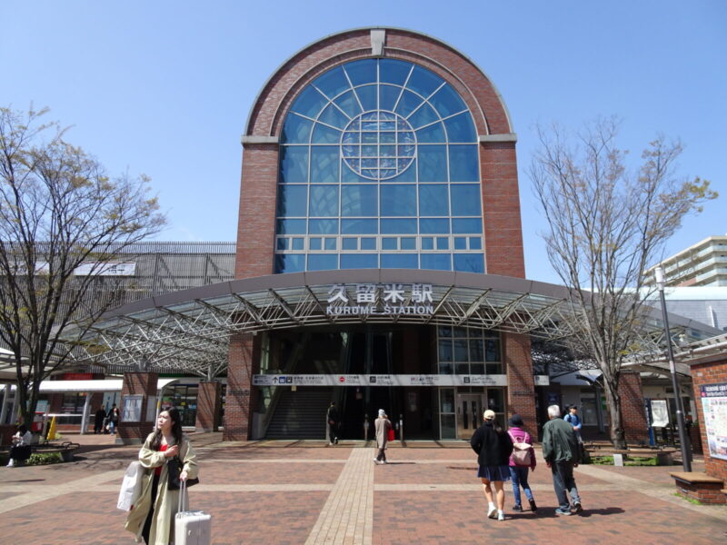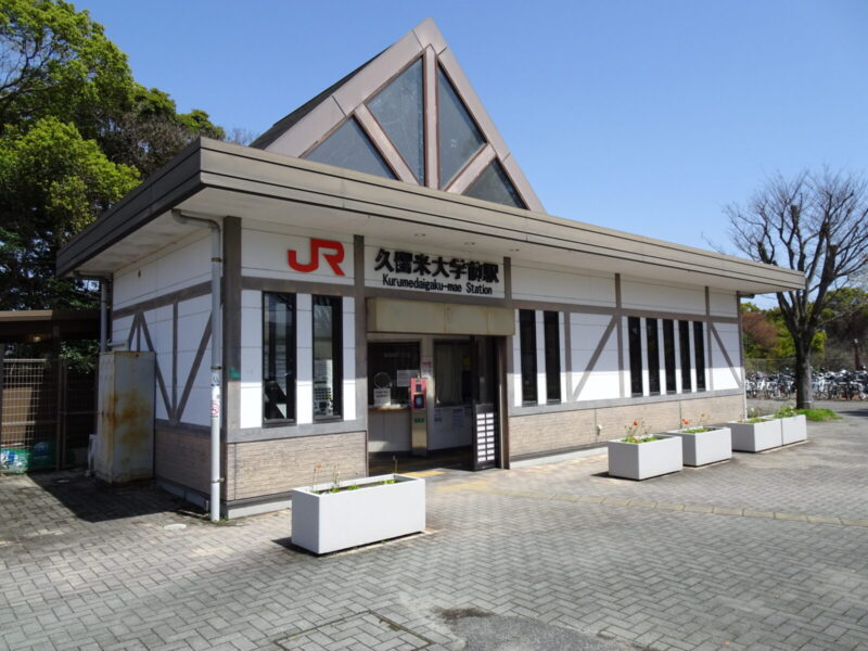 寒い寒い冬から徐々に暖かくなってきて花粉と戦っている時期でもある3月下旬の11時頃、二人は博多駅から快速電車に乗り久留米駅に到着しましたが、久留米大学前駅に行くために乗り換えが必要で、少し時間があいていたので駅周辺を散策しています。