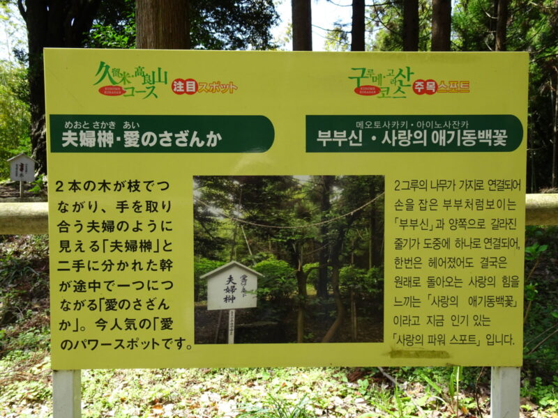 二人は何やら黄色い看板を発見したので確認しにいくと、夫婦榊・愛のさざんかという木があるみたいですね見にいきましょう。