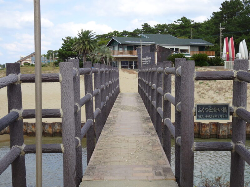 前方に小さい川でしょうか?砂浜との間を横断して飛び越せない幅なんですが、小さい橋がかかっていました「ふくつ出会い橋」というらしいです。「こんな短い距離で出会いなんてないさ」とるんは言って渡っていました・・・。